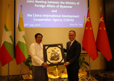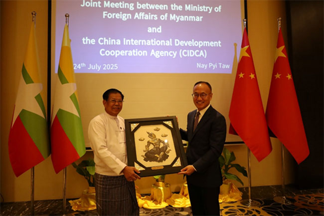 A joint meeting between the Myanmar delegation led by H.E. U Than Swe, Deputy Prime Minister and Union Minister for Foreign Affairs, and the delegation led by H.E. Mr. Chen Xiaodong, Chairman of the China International Development Cooperation Agency (CIDCA), was held at 0930 hrs on 24 July 2025 at Park Royal Hotel in Nay Pyi Taw.