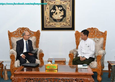 During the meeting, they cordially discussed matters pertaining to cooperation on reconstruction in the affected areas following the Mandalay earthquake. They also exchanged views on enhancing cooperation in areas of mutual interest and agreed to continue working together to further strengthen the friendly relations between the two countries.