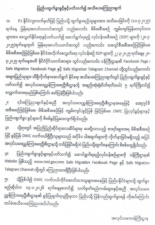 ပြည်ပထွက်ခွာခွင့်နှင့်ပတ်သတ်၍ အသိပေးကြေညာချက်
