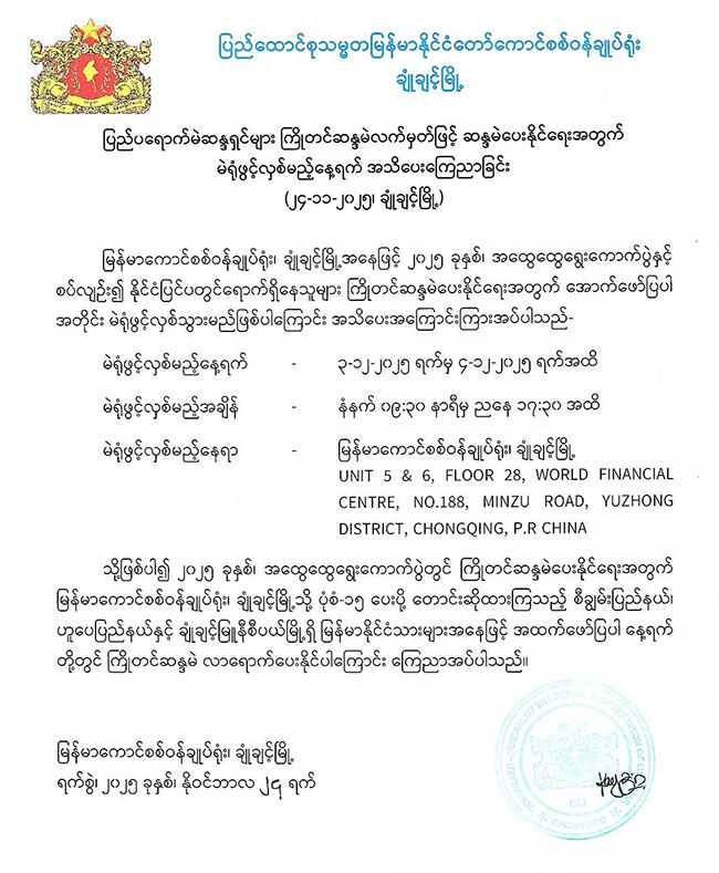 ပြည်ပရောက်မဲဆန္ဒရှင်များ ကြိုတင်ဆန္ဒမဲလက်မှတ်ဖြင့် ဆန္ဒမဲပေးနိုင်ရေးအတွက် မဲရုံဖွင့်လှစ်မည့်နေ့ရက် အသိပေးကြေညာခြင်း (၂၄-၁၁-၂၀၂၅၊ ချုံချင့်မြို့)
