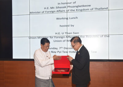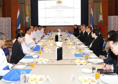 The Foreign Ministers further discussed ways to strengthen closer cooperation to address common issues and promote mutual interests of Myanmar and Thailand. The Union Minister reaffirmed that, for the prosperity of both sides, the door is always open to Thailand for enhanced cooperation between the two Foreign Ministries.
